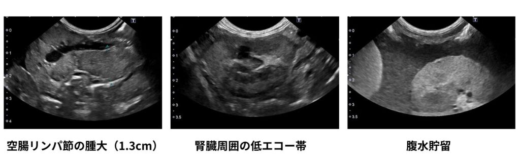 これらはいずれもFIPで比較的よく認められる所見ですが、画像検査のみで確定診断に至ることは困難です。鑑別診断のためには、生検による細胞診、PCR検査、組織学的検査などが必要となります。特に臨床現場では、リンパ腫との鑑別が重要なポイントとなります。