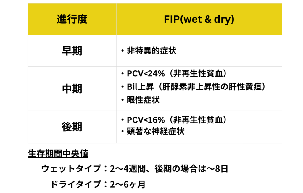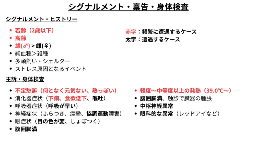上図は一般的に言われているFIP症例のシグナルメント・稟告・身体検査所見をまとめたものです。