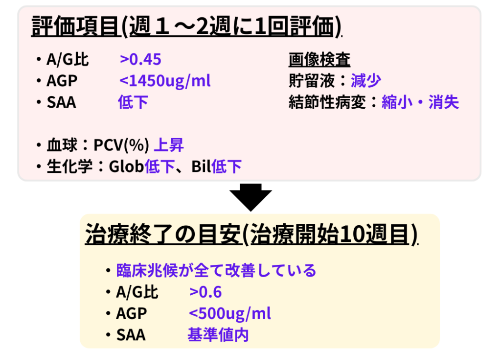抗ウイルス薬などを用いてFIP治療を行う場合、治療開始後1か月間は原則として週1回、その後は2週に1回程度の頻度で臨床症状および検査所見を評価し、治療反応を判定します。