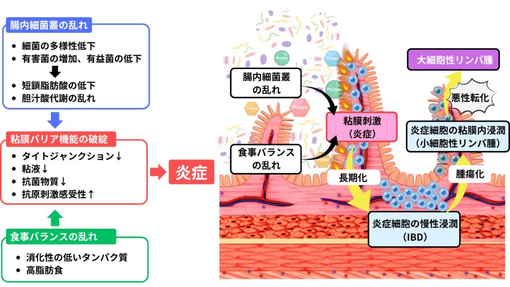このような状態では、腸管内抗原に対する過剰な炎症反応や免疫応答が惹起されやすくなり、特に食事由来タンパク質に対する反応性が亢進すると考えられています。