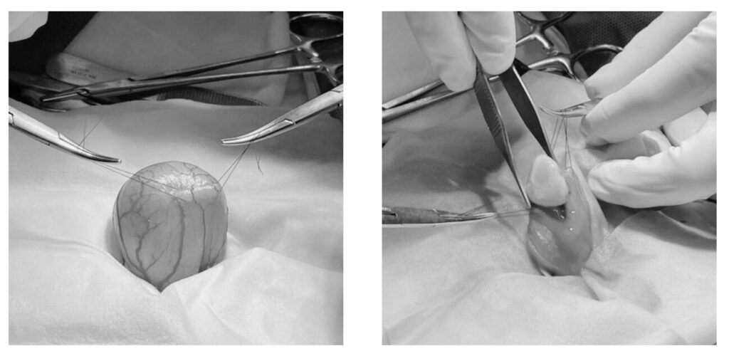 また、摘出後の再発も考慮し、腹壁との癒着を防ぐ目的で膀胱背側を切開するよう心がけています。