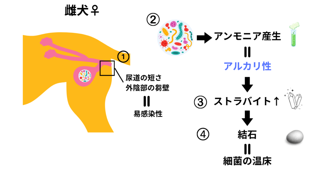 実際、臨床的にも雌犬ではストルバイト結石の発生が多く、その背景には単なる体質ではなく、明確な病態の流れが存在します。