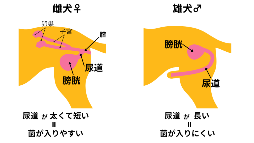 雌犬の尿道は雄犬と比較すると太く短いため、外陰部が外界に近いこともあり、細菌感染が成立しやすいと考えられます。
